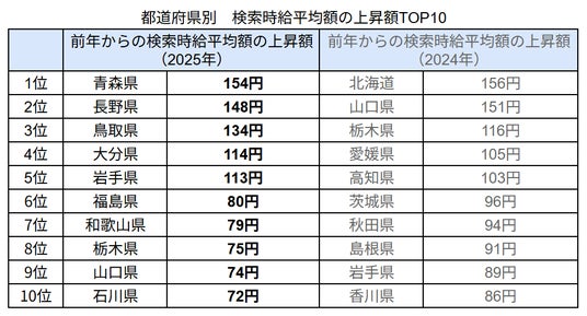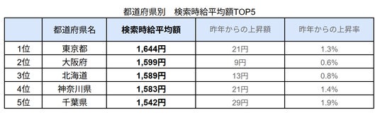 都道府県別の検索時給は、上位4位は昨年と変わらず、東京都(1,644円)、大阪府(1,599円)、北海道(1,589円)、神奈川県(1,583円)の結果。一方、昨年からの検索時給の上昇額では、上位の顔ぶれが大きく変わり、今年の上位3位は青森県(+154円)、長野県(+148円)、鳥取県(+134円)。地方圏が上位を占めるのは昨年と変わらず。