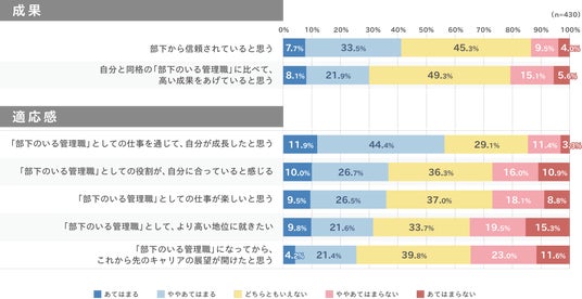 ・また、「自部署や部下の仕事経過や成果を把握する」「部下の適性を見極め、役割に割り当てる」「部下に業績相応にチャンスを与える」など、メンバー育成に関わる行動についても肯定的回答が多く、管理職が部下の育成や成果創出に一定程度やりがいを感じている様子がうかがえる。