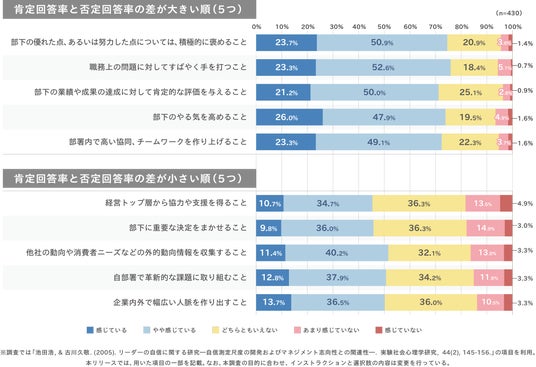・また、「部下に重要な決定を任せる」といった権限委譲に関する行動についても、肯定的回答の割合が比較的低く、部下への意思決定の委任は十分にやりがいを感じられていない可能性が示唆される。