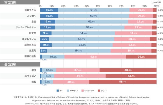 また、管理職が抱くメンバーに対するイメージは全体として肯定的な傾向が強く、「『信頼できる』チーム・プレイヤーが多い」といった認識を持つ管理職が多いことが確認されています。一方で、主体的に組織を支えるフォロワーシップ行動をとるメンバーについては、必ずしも「多い」と認識しているわけではなく、評価は分かれる傾向が見られました。