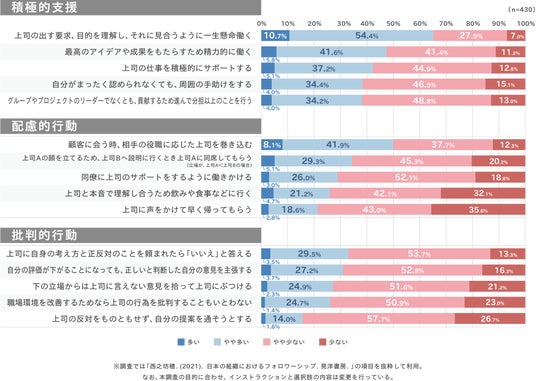 ・一方で、「下の立場からは言えない意見を拾って上司に伝える」「自分の評価が下がることになっても正しいと思う意見を主張する」「職場環境を改善するために上司の行為を批判する」といった批判的行動については、肯定的回答が3割程度にとどまり、上司に対して異議を唱える行動は相対的に少ないと認知している傾向が見られる。