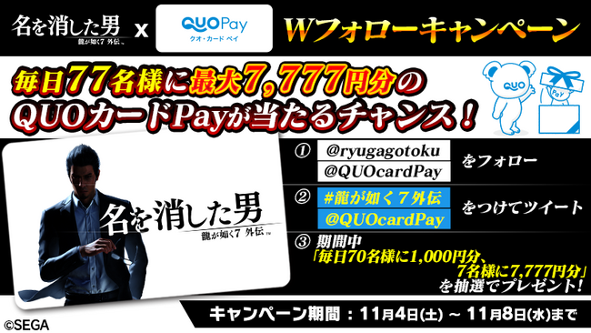 株式会社クオカード(以下当社、本社:東京都中央区、代表取締役社長:近田 剛)が展開するスマートフォンで使えるデジタルギフト『QUOカードPay(クオ・カード ペイ)』は、株式会社セガ(本社:東京都品川区、代表取締役社長COO:杉野 行雄)と連携し、11/9(木)の『龍が如く7外伝 名を消した男』発売を記念したX(旧Twitter)のWフォローキャンペーンを11/4(土)より開催いたします。