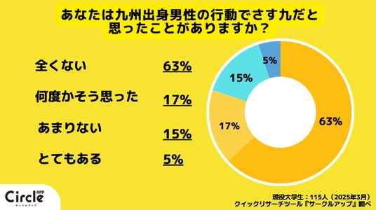 あなたは九州出身男性の行動で#さす九だと思ったことがありますかという質問に対し、全くそう思わないと回答した人は63%、少しそう思うと回答した人は15%、何度かそう思ったと回答した人は17%、とてもそう思ったことがあると回答した人は5%でした。