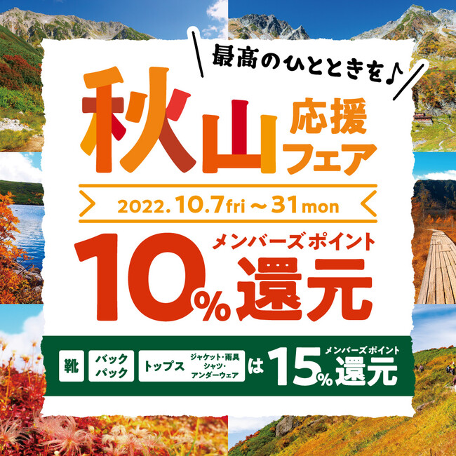 登山・クライミング・アウトドア用品総合専門店、クライミングジムを運営する株式会社好日山荘(本社:兵庫県神戸市、代表取締役社長 池田 真吾)は、10月7日(金)より好日山荘全店(フランチャイズ店含む)でメンバーズポイントが最大15%還元となる「秋山応援フェア」を開催します。