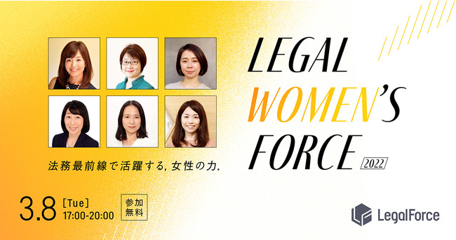 AI契約審査プラットフォーム「LegalForce」、AI契約管理システム「LegalForceキャビネ」を提供する株式会社LegalForce(本社:東京都江東区、代表取締役:角田望、以下LegalForce)は、3月8日(火)17時より、「Legal Women's Force 2022~法務最前線で活躍する女性の力~」を開催します。法務最前線で活躍する女性が、法務パーソンとしていま何を考え、どんなことに挑戦しているかについて、トークセッション形式でお伝えします。なお、本イベントは全てのスピーカーを女性で構成しておりますが、ご参加いただく方は性別を問わずどなたでも参加可能です。