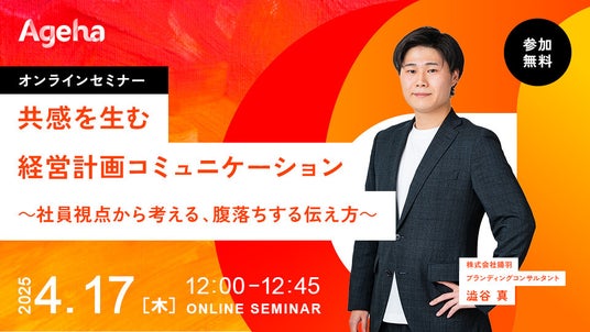 コーポレートブランディング支援を行う株式会社揚羽(東京都中央区 代表取締役社長:湊 剛宏 証券コード:9330)は、「共感を生む経営計画コミュニケーション ~社員視点から考える、腹落ちする伝え方~」と題したオンラインセミナーを、2025年4月17日(木)に開催します。
