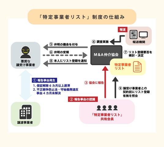 当協会は、報告事由について共有会員からの報告、または報道があった場合、調査を実施の上、リスト登録の要否を検討・決定します。また共有会員は今後、譲受け事業者との契約を結ぶ際に、特定事業者リストへの登録の有無を確認できます。事実上、悪質な譲受け事業者がM&A市場から締め出されることとなります。