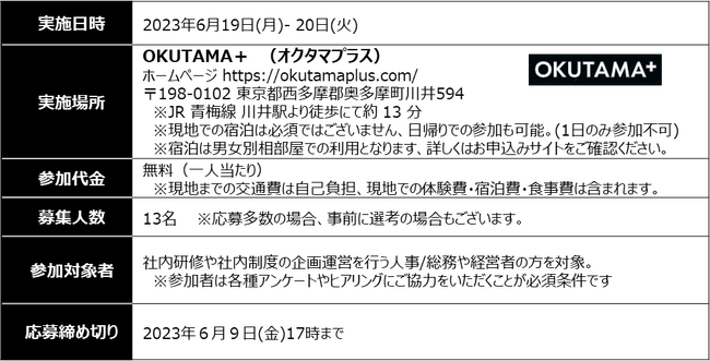 都心からほど近い自然豊かな奥多摩町での刺激的な仕事環境で地域特有の自然資源を五感で体感して頂き、ビジネスのヒントや成長のきっかけを掴む人材育成型「ワーケーション」の実証実験をおこないます。