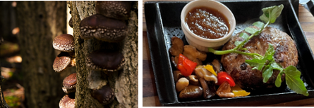 奥多摩の森の中で育てた原木椎茸を利用した「秋川牛と奥多摩しいたけのハンバーグ」の食事。