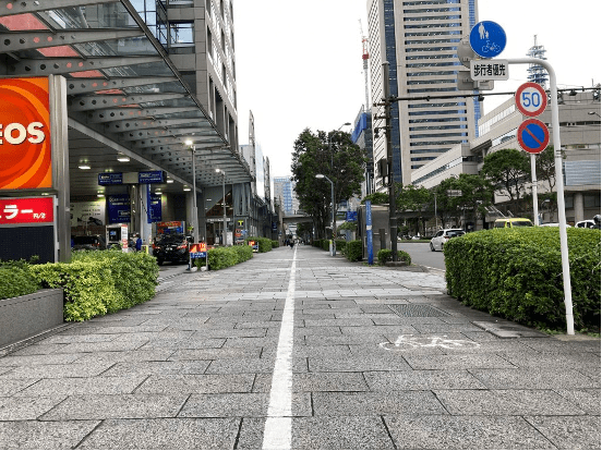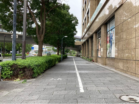 エリア内には、歩道内に自転車マークがペイントされた自転車用のレーンが複数ありますが、歩道の中に自転車のレーンがあったとしても、電動キックボードはここを走行してはいけません。車道の最も左の車両通行帯、もしくは普通自転車専用通行帯を走行してください。