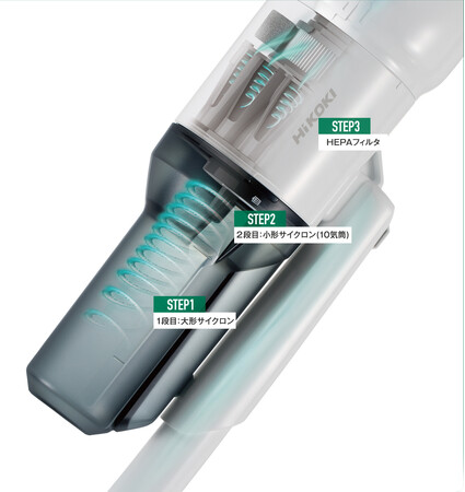 2段サイクロン+高性能(HEPA)フィルタ※5を搭載しました(特許出願中)。大きなゴミと空気を大形サイクロンで遠心分離後、細かい粒子を小形サイクロン(10気筒)で遠心分離します。残った微粒子は高性能(HEPA)フィルタ※5がキャッチするため、フィルタが目詰まりしにくく、強い吸引力が持続します。