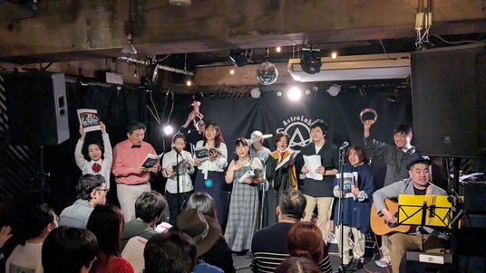 定刻を迎えMCによる挨拶が終了すると、メンバーによる演奏付きの歌唱でイベントが開幕。冒頭から歌で始まる予想外の構成に驚きつつも、大きな歌声や手拍子が会場の空気を一気に温めていきます。本編の朗読劇では免許返納から魔法少女までジャンルを問わない多彩な作品が展開され、出演者が入れ替わり立ち代わり登場して演じていきます。途中からは人形劇も始まり、人間と人形が共演するなど他に類を見ない構成の朗読劇からは、参加者主催イベントならではの勢いや自由な発想が強く感じられました。
