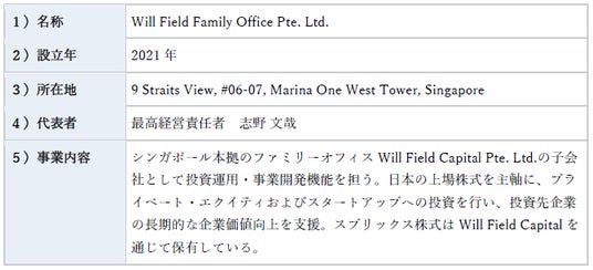 株式会社スプリックス(本社:新潟県長岡市、代表取締役社長:常石 博之、東証スタンダード市場:7030、以下「スプリックス」)とWill Field Family Office Pte. Ltd.(本社:シンガポール、最高経営責任者:志野 文哉、以下「Will Field」)は、本日、スプリックスの持続的な成長と企業価値向上に向けたパートナーシップ契約(以下「本契約」)を締結しましたので、お知らせいたします。
