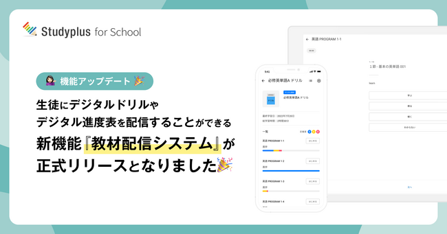 スタディプラス株式会社(本社:東京都千代田区、代表取締役:廣瀬高志、以下スタディプラス)は、教育機関向け学習管理プラットフォーム「Studyplus for School」の新機能「教材配信システム」を、正式に提供開始することをお知らせいたします。