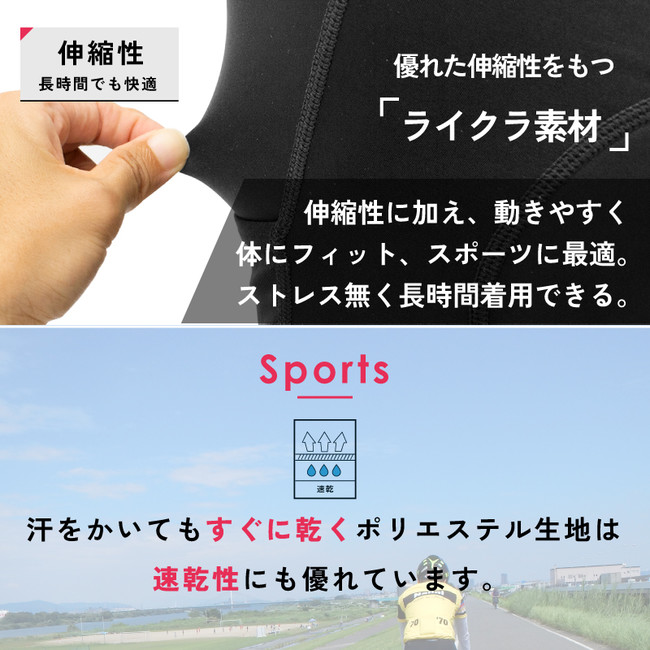 伸縮性、速乾性に優れているので長時間もストレスなく着用できます。