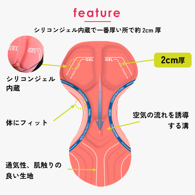 分厚い約2cmシリコンジェル内蔵パッドを配置。