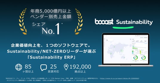 統合型SXプラットフォーム「サステナビリティERP(※1)」の提供と「サステナビリティ2026問題」の提唱により企業のサステナビリティ・トランスフォーメーション(SX)(※2)の加速を支援するBooost株式会社(東京都品川区、代表取締役:青井宏憲 以下 当社)は、株式会社アイ・ティ・アール(ITR)が発行した市場調査レポート「ITR Market View:予算・経費・サブスクリプション管理市場2025」の「サステナビリティ情報管理ツール市場」において、年商5,000億円以上の規模でのベンダー別売上金額シェアが22.4%を獲得し、第1位(2024年度予測)となりました。