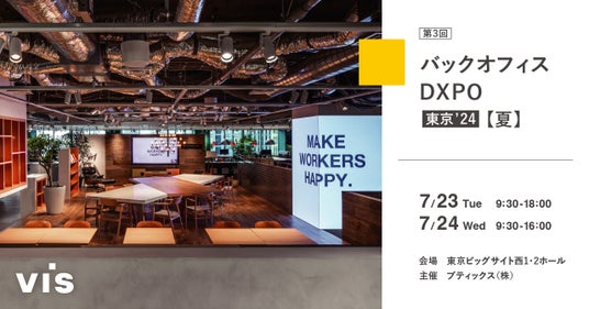 ワークデザインを手がける株式会社ヴィス(本社:大阪市北区、代表取締役社長:金谷智浩)は、2024年7月23日(火)、24日(水)に東京ビッグサイト(東京都江東区)にて開催される「第3回バックオフィスDXPO(ディーエクスポ) 東京′24」に出展することをお知らせします。