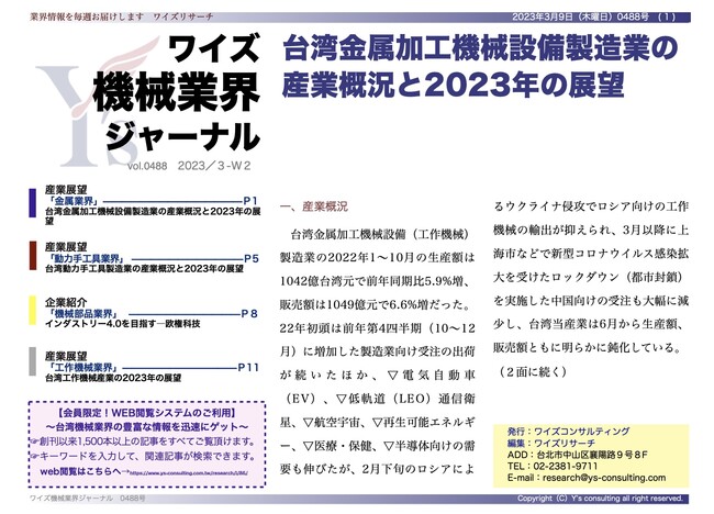 ワイズコンサルティング グループ(本社:中華民国台北市、代表取締役:吉本康志)は台湾機械業界専門誌「ワイズ機械業界ジャーナル」の2023年3月第2週号を発行しました。今週号では金属業界、動力手工具業界、インダストリー4.0を目指す欧権科技(Auto Cam)と工作機械業界の最新動向を紹介します。