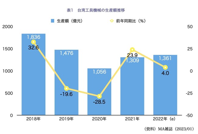 台湾工作機械産業は、22年上半期(1~6月)は各国の経済活動再開、製造業の生産、投資拡大を受けて好調が続いたが、下半期(7~12月)は原料価格の高騰による世界的なインフレ、米利上げの影響で製造業の生産、投資が押し下げられ、工作機械の需要が鈍化した。また、円安により日本製工作機械の輸出競争力が高まり、台湾製工作機械の輸出に不利になった。
