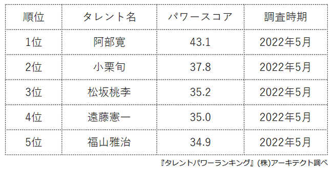 本ランキングは、2022年5月度に実施したタレント調査データ(一部過去実施データ)を利用し、タイトルに応じてランキング形式でまとめたものです。
