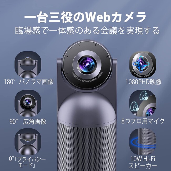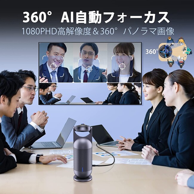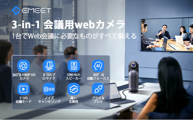 EMEET ウェブカメラは360度カメラ、8つのマイクアレイと10Wスピーカーの一台三役Webカメラです。会議参加者全員の画像と声がはっきり表示されます。AI自動フォーカス技術により、発言者を瞬時に自動フォーカスできます。EMEET webカメラは、カメラマンのように発言者に素早くカメラを向け、声と画像をスムーズ且つきれいに投影し、臨場感があるWeb会議を展開します。他社との違いは、EMEET web コラボレーションモード/スピーチモードで、AI自動フォーカス機能の感度を3段階調整可能です。※ 法人様向けデモ機貸出サービス提供できますので、どうかサポートセンターに連絡してください。