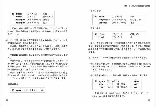 基本的な文法をわかりやすく説明し、日常生活でよく使う単語(約900語)をジャンル別にまとめています。音声ダウンロード付き(日本語、フィリピン語)。