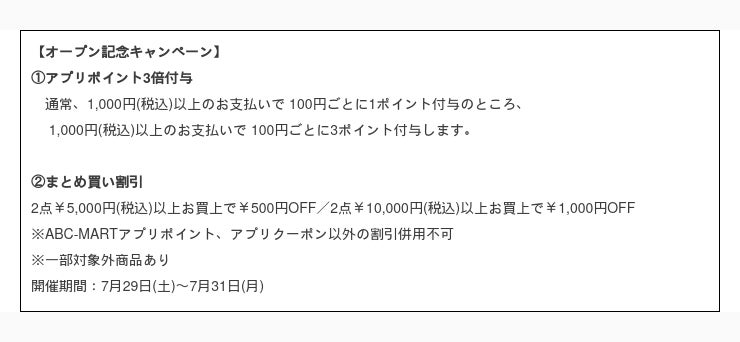 オープンを記念して、「ABC-MART ゆめタウン飯塚店」にて7月29日(土)よりお買い物をおトクに楽しめるキャンペーンも開催します。
