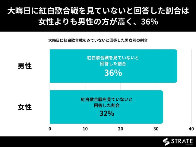 大晦日に紅白歌合戦を見ていないと回答した割合を男女別でみてみますと、男性が36%、女性が32%という結果になりました。