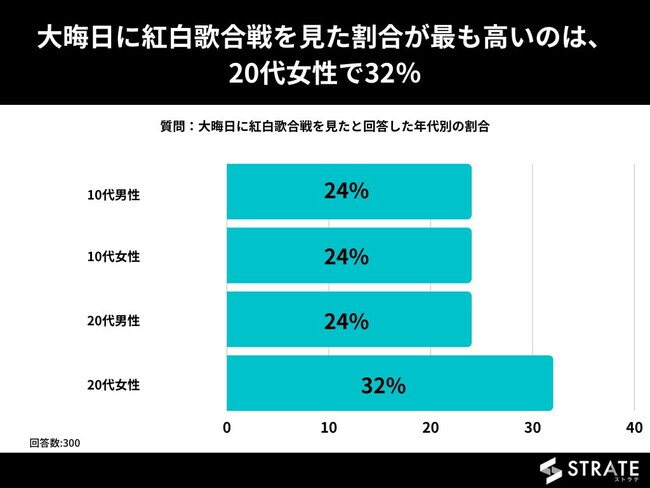 大晦日に紅白歌合戦を見た割合を年代と男女別でみてみますと、10代男性が24%、10代女性が24%、20代男性が24%、20代女性が32%という結果になりました。