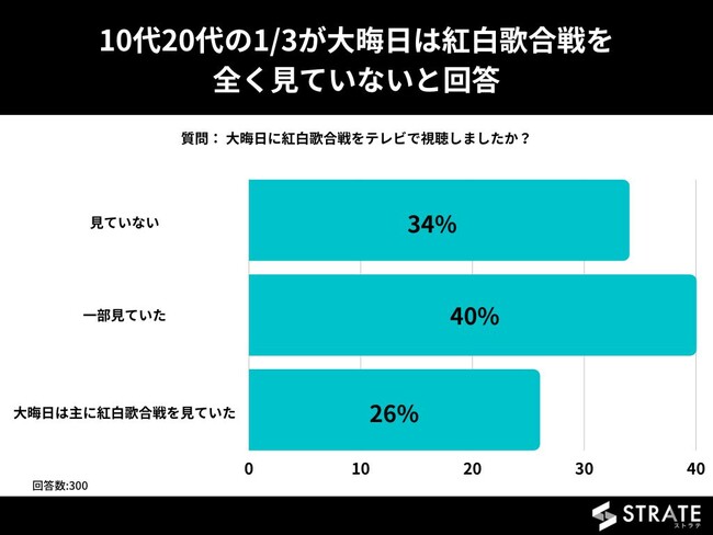 10代~20代の男女を対象とした「大晦日に紅白歌合戦をテレビで視聴しましたか?」というアンケートで最も多かった回答は「一部見ていた」で40%でした。