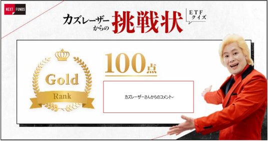 ETFの投資経験がない方や投資を始めたばかりの方も、高得点を目指してクイズに挑戦。獲得した点数に応じて異なるカズレーザーさんからのコメントも楽しみながら学べます。