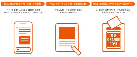 混雑する会場内でも快適に過ごせる5GやStarlinkなどの通信に加え、終日開催のイベントにも安心して参加できるスマートフォンの無料充電サービスや、auブースのフェスオリジナルグッズがもらえる特典、生成AIで作成したイラストにメッセージを書いてポストに投函し想いを届けるコンテンツ「au ORANGE POST」などを提供します。
