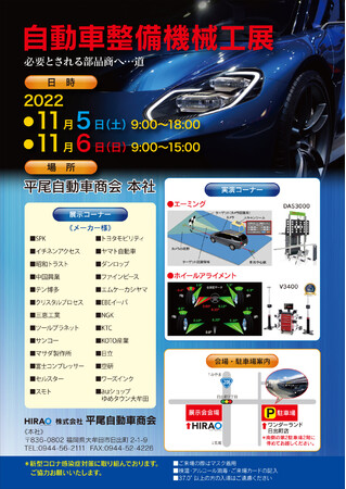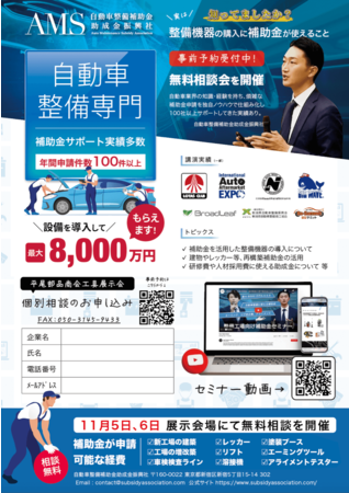 カスタマークラウド株式会社(本社:東京都新宿区、代表取締役:木下寛士、英文:CUSTOMER CLOUD)のグループで自動車整備・鈑金塗装業界に特化した財務コンサルタント 自動車整備補助金助成金振興社は、11月5-6日開催の「平尾自動車商会 自動車整備機械工展」の会場にて補助金相談会を開催させていただきます。