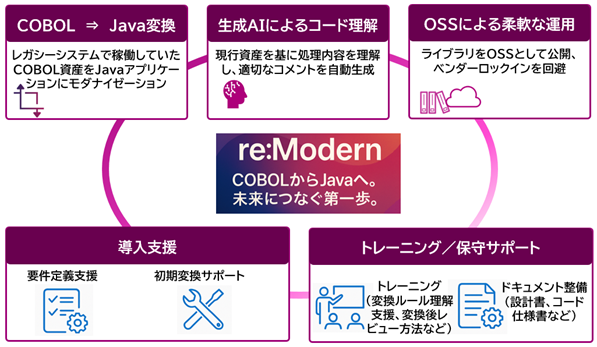 re:Modernは、COBOLで構築されたレガシー資産をJavaへ自動変換する、CTCが持つシステム構築の豊富な経験と実績を活かして開発した自社サービスです。変換結果の有効性と作業効率を大幅に向上させる施策として、生成AIを用いて、既存の設計書やプログラムから、処理内容を理解し、適切なコメントを変換後のコードに自動反映する機能も備えています。COBOLの専門知識がない開発者でも、既存システムの処理内容を把握しやすくなり、属人化の解消に加え、システムの新旧比較やJava開発者による旧システムの理解支援など、リビルド(既存システムを参考に再構築する開発手法)時の活用にもつながります。