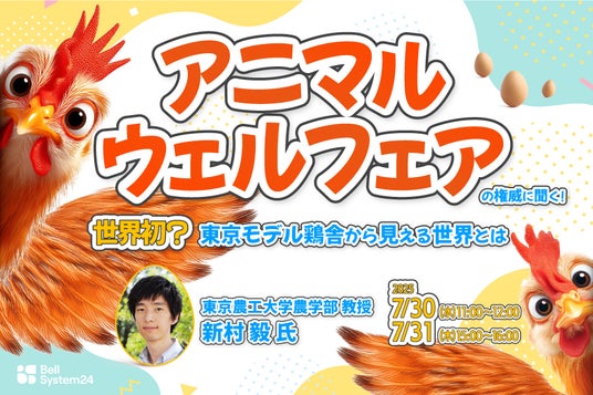 株式会社ベルシステム24(本社:東京都港区、代表取締役 社長執行役員:梶原 浩、以下:当社)は、動物福祉をテーマとした、対談形式のイノベーターズラウンジ「アニマルウェルフェアの権威に聞く!世界初?東京モデル鶏舎から見える世界とは」を、7月30日(水)・31日(木)の2日間にわたって開催します。