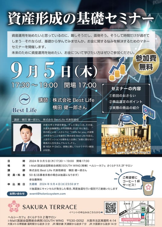 医療法人医誠会(本社:大阪府大阪市、代表者:谷幸治)が運営する医療複合施設「i-Mall」内のさくらテラスにて資産運用の基礎から学べるマネーセミナー(主催:ホロニクスヘルスケア株式会社)を開催します。金融や保険に関心がある30代から50代の方々に向けて、確定拠出年金(iDeCo)やNISAなどの資産形成方法を詳しく解説。資産運用の第一歩を踏み出すための絶好の機会です。