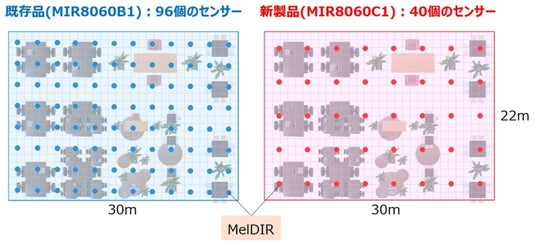 図2:既存品と新製品の設置台数比較(200坪のオフィス内を天井からモニタリングした場合)