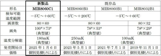 三菱電機株式会社は、人・物の識別、行動把握を高精度に実現するサーマルダイオード赤外線センサー「MelDIR(メルダー)」の新製品として、100°×73°の広画角化により、既存品(※1)の2倍以上の検知面積を実現した「MIR8060C1」を2025年1月6日に発売します。センサー1台のモニタリング範囲が広がることに加え、広い空間を複数台でモニタリングする場合の設置台数の低減が可能になります。本製品により、高齢者施設での見守りや防犯をはじめ、ビルや商業施設などでの空調機器制御、人数カウントソリューション、体表面温度測定などに活用されることで、安心・安全で快適な暮らしの実現に貢献します。