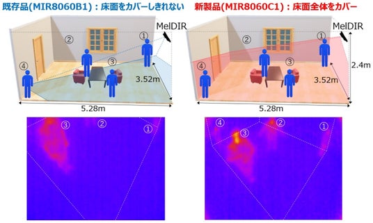図1:部屋に設置した場合の既存品と新製品の検知可能範囲比較(上図)と熱画像比較(下図)
