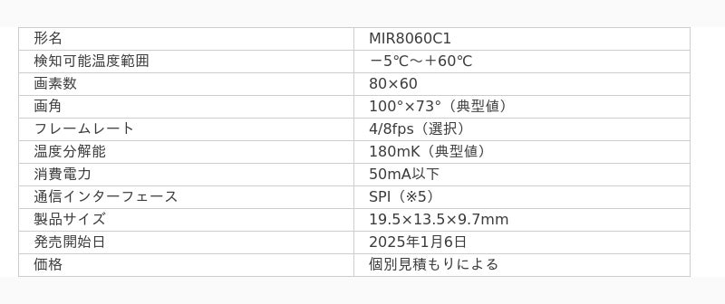 100°×73°の広画角化を実現した80×60画素 サーマルダイオード赤外線センサー「MelDIR」MIR8060C1