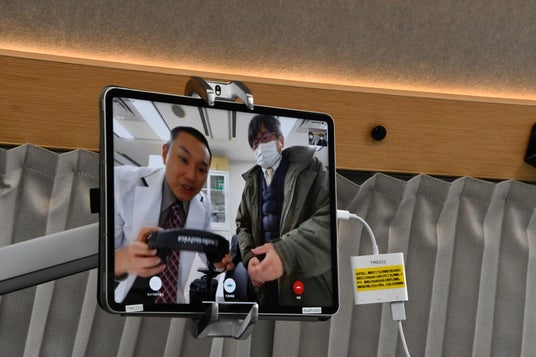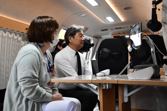 セレモニーには、関係者ら約40人が出席。オンライン診療のデモンストレーションでは、患者役として移動診療車に乗った田中明高山市長の胸に看護師が電子聴診器を当て、離れた場所にいる医師に心音を共有するなどオンライン診療を体験しました。