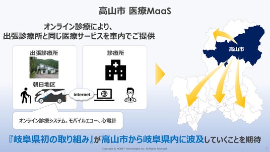 このような中、遠隔地にいる医師によるオンライン診療を車両内で受けられる環境を整備することで、居住地域によって受けられる医療サービスの格差の縮小や、特に医療資源の乏しいへき地において、患者の早期治療や重篤化予防を目指すと共にオンライン診療による医師の訪問先への移動時間削減による業務効率化の実現のため、移動診療車を使った医療サービス『医療MaaS』の実証運行を始めることとしました。岐阜県内の自治体では初の導入となります。