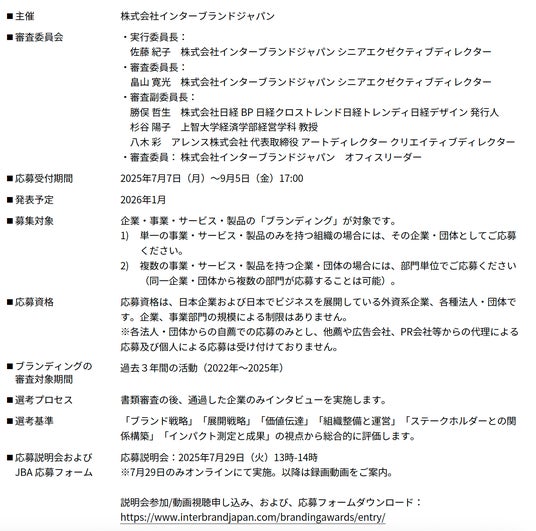 日本最大級のブランディング会社である株式会社インターブランドジャパン(東京都中央区、代表取締役会長 兼 社長 兼 CEO:ゴンザロ・ブルーホ)は、「ブランディング」の取り組みを評価する日本初のアワード「Japan Branding Awards 2025」を開催いたします。ブランド戦略を展開する企業・団体のさらなる成長の支援を目的に、優れたブランディングを実行している企業・団体における事業・サービス・製品を評価し、その活動内容を広く紹介、共有する機会を提供します。今年は7回目の開催となり、2026年1月に受賞ブランドを発表します。