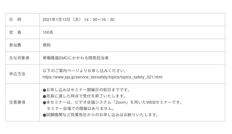 「JQA車載機器専用EMCラボ 竣工記念セミナー」につきましては、Zoomを用いたオンラインでの開催となります。お申し込みは、JQAのホームページよりお願いいたします。皆さまのご参加を心よりお待ちしております。なお、設備の見学をご希望のお客さまにおかれましては、別途ご連絡ください。