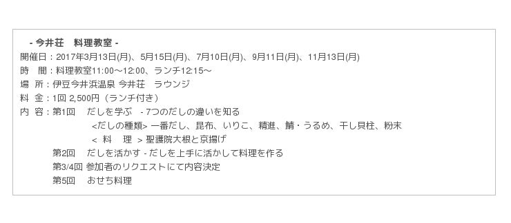 アゴーラ・ホテルアライアンスの伊豆今井浜温泉 今井荘(所在地:静岡県賀茂郡河津町見高127、支配人:西尾 恵介、客室数:45室)は、「今井荘 料理教室」を3月13日(月)より全5回開催いたします。