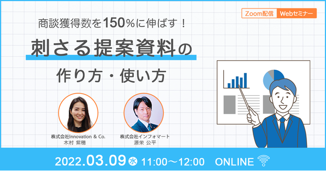 東京都渋谷区、代表取締役社長:遠藤俊一、以下「Innovation & Co.」は、株式会社インフォマート(本社:東京都港区、代表取締役社長:中島健、以下「インフォマート」)と『商談獲得150%に伸ばす!刺さる提案資料の作り方・使い方』をテーマとしたセミナーを2022年3月9日(水)に開催します。