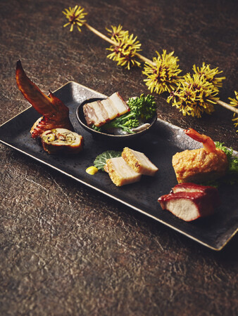 食べ応えのある自家製チャーシュー、食感が楽しいクリスピーポーク、香ばしい手羽先とナッツの焼き物はレストランの窯焼きで。風味豊かな海老のトースト揚げ、美味しさの詰まったスモークポークとともにディナーが始まります。