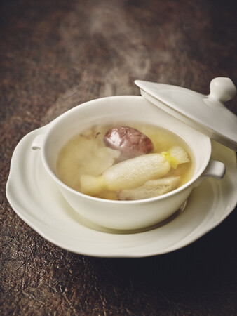 一番出汁の上湯(シャンタン)スープにネギ、生姜、金華ハム、乾燥干しシイタケをくわえ8時間蒸した極上スープは頂湯(チョートン)スープともいわれています。具材はすっぽんのえんがわ、衣笠だけ、つばめの巣、乾燥山芋、乾燥シイタケ、クコの実、なつめ、なまこ、干し貝柱、杏仁、ハト麦、ほか、自然の恵みを享受する優しい味わいです。