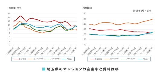 東京 23 区への時間距離が若干遠いさいたま市では、マンションの 0-20 平方メートル を除き、空室率の悪化がようやく止まりました。アパートの 50 平方メートル -を除き、支払賃料は上昇を継続しています。